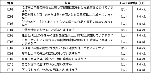 ご自身の状態を確認してみましょう(表)。「いいえ」に○がついた項目については、改善し予防につなげましょう。