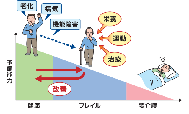 人は、年齢を重ねていくと心身や社会性などの面でダメージを受けたときに回復できる力が低下します。この低下が続くと、健康に過ごせていた状態から、介護が必要な状態(要介護状態)に変化していきます。しかし、早い段階で家族や医療者が気付き対応することができれば、フレイルの状態から健常に近い状態へ改善したり、要介護状態になることを避けられる可能性があります(図)。